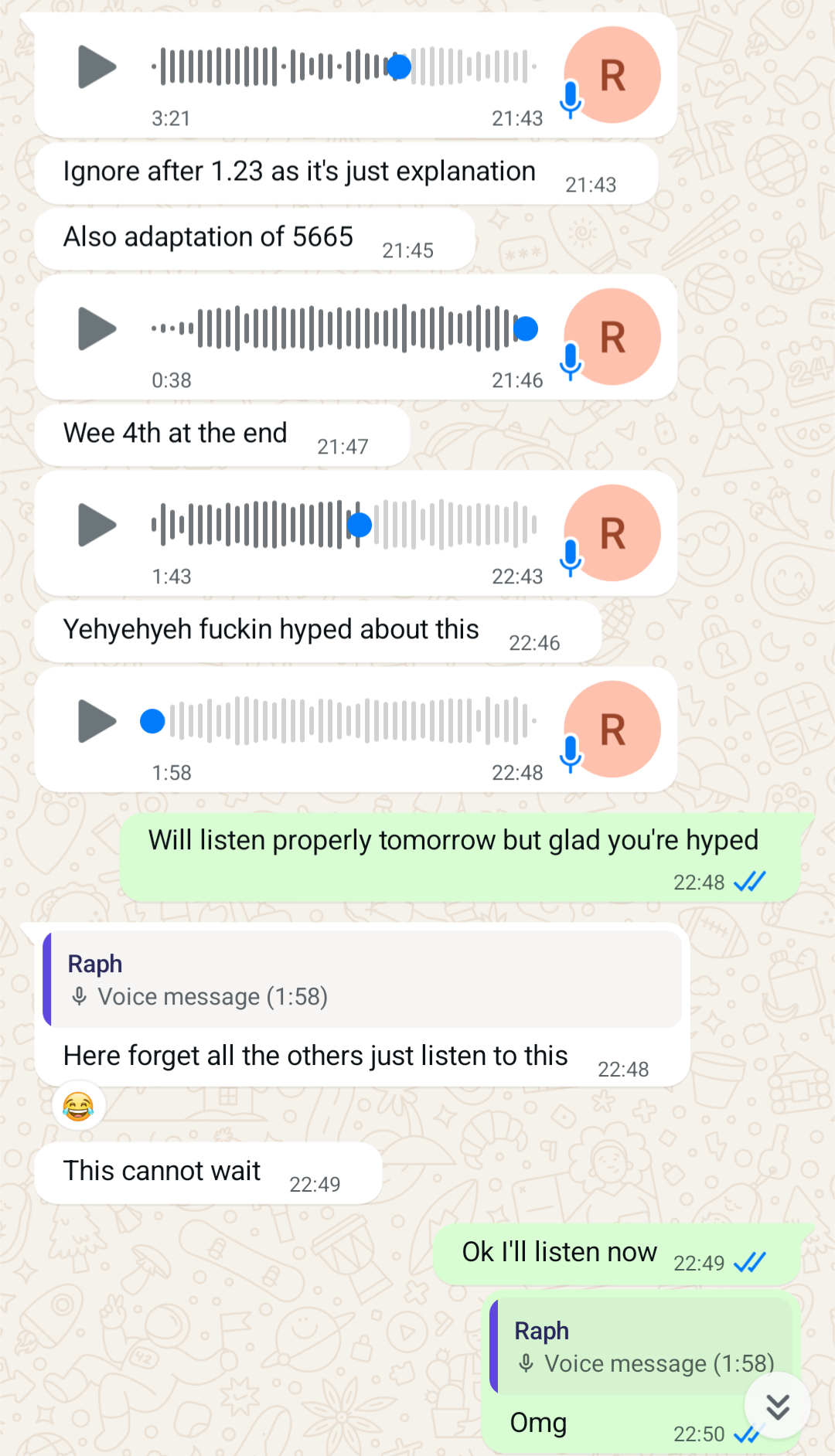 He was also a wonderful songwriter, always challenging himself to try and write difficult but beautiful songs. One of my last bits of song recordings from Raph - since we often sent each other “works in progress” - was this flurry of 10 messages and voicenotes from over an hour, of him working on a song in some silly complicated time signature where you hear him go from working on a kernel of an idea - a simple guitar riff - all the way to a fully developed two minute song. It’s a perfect set of snapshots listening to him write something beautiful so quickly, and also so difficult to do.